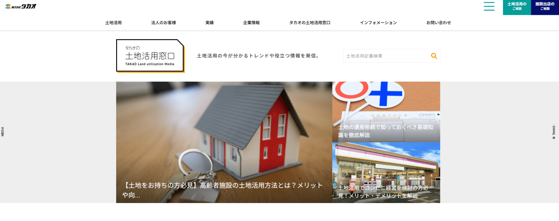 「タカオの土地活用窓口」は、株式会社タカオが運営する、土地所有者や不動産活用を検討する方に向けた専門情報メディアです。